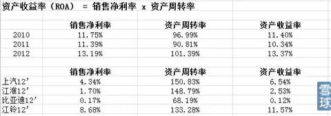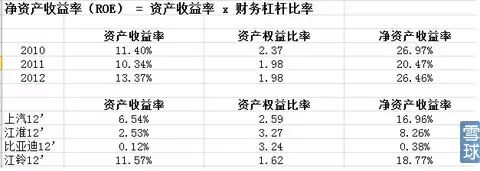 数据分析a.通过比较,我们可以看出,汽车行业的资产周转率普遍非常高。这仍旧与其“准时化生产”的商业模式有关。b.长城在同行的竞争对手中,只能算中等偏下的水平。4.资产收益率(ROA)关于ROAa.与销售净利率相似,ROA告诉我们一家公司的资产能产生多少利润。b.如果ROA =10%,那么这家公司每1元的资产,就有1毛钱是净利润。