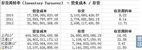 数据分析a.通过分析长城3年的数据,我们可以看到存货呈下降的趋势,同时存货占总资产的比率也呈下降的趋势。b.通过比较,我们可以看出汽车行业普遍存货都在减少(除比亚迪2012年遭遇了很多不顺的事情以外),汽车是个周期性行业,存货的不断减少可以证明这个产业目前还在发展,没有进入衰退期。b.存货周转率(Inventory Turnover)关于存货周转率a.由于存货占用资本(现金转化成存货放在仓库里不能做任何事情),所以一家公司的存货周转率对收益率有巨大的影响。b.汽车公司的存货加压问题后果并不会这样严重,而对一家高科技企业(存货贬值很快)或者乳制品企业(存货很快过期)来说,周转慢糟透了。c.存货周转率的好坏反映企业存货管理水平的高低,它还影响到企业的短期偿债能力。