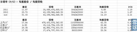 数据分析a.通过比较,我们可以看到长城的股息收益率算是行业中等水平。9.市销率(P/S)=股价/每股营收关于市销率a.运用这一指标来选股,可以剔除那些市盈率看起来很合理,但主营又没有核心竞争力而主要是依靠非经常性损益增加利润的股票。b.由于销售通常比净利润稳定,而市销率又只考虑销售,市销率很适合去衡量那些净利润年与年之间差距大的公司。c.高市销率意味着市场对公司的盈利能力及成长性有更多的期待,而低市销率则意味着投资者为这家公司每元的销售付出的价格很少。d.市销率通常只在同行业中作比较,而且它通常用来衡量业绩很差的公司,因为它们通常没有市盈率可以参考。