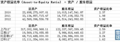 数据分析a.对于除了长城和江铃以外的企业,我们可以很明显的看出来低额的销售净利率,拖累了最终的ROA。b.同时,通过比较,我们也可以看出,长城的ROA在同行中处于高水平。5.资产权益比率(Asset-to-Equity Ratio)关于资产权益比率a.资产权益比率用来反映一家公司负债相对于所有者权益的程度,测量的是偿付能力。b.如果一家公司属于周期性行业或者收益不稳定,而它又有过高的资产权益比率,保持警惕!因为“总资产=股东权益+负债”,如果股东权益非常小,那就意味着负债将会很高。