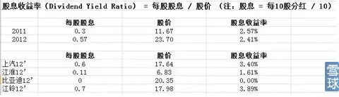 数据分析a.由于我认为这项数据并非非要在同行中做比较,再加上计算过程实在太繁琐,所以我偷懒了,没有做另外四家公司的分析。b.同时,由于长城2011年年报中没有提及到2010年期初的一切数据,所以我只取了两年的数据。c.虽然可比性不强,但是可以看出长城的ROIC不仅在改善,还维持在一个较高的水平。8.股息收益率(Dividend Yield Ratio)关于股息收益率a.股息率是挑选收益型股票的重要参考标准,如果连续多年年度股息率超过1年期银行存款利率,则这支股票基本可以视为收益型股票。