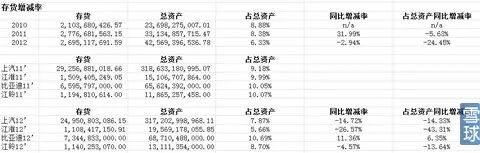 数据分析a.通过分析长城3年的数据,我们可以看出长城的资金流动性较好。5.存货(Inventory)关于存货增减a.不论对于制造商还是零售上来说,存货的增加通常是一个不好的兆头。当存货增长速度比销售增长速度还快的时候,这就是一个非常危险的信号了。b.如果公司不能把积压的存货全部处理掉,那么明年存货积压就会成为一个大问题,后年将会更严重。新生出来的产品将与积压的老产品在市场上形成竞争关系,导致存货积压的更多。最终积压的存货逼得公司只能降价处理,而降价就意味着公司的利润将会下降。c.如果一家经营状况不景气的公司存货开始逐步减少,那么这应该是公司经营情况好转的第一个信号。