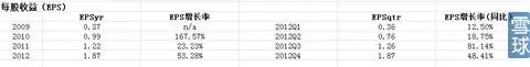 数据分析a.长城的净利润增长率就偏高,在分析其背后的原因后,主要是销售带动的,而不是其他一次性利润。但是不少人,包括我,都对长城是否能保持如此之高的增长打了问号。因此,我们需要不断地关注长城是否像它既定的方案那样,如期推出了新车充实产品线,还要关注它每个季度国内和海外销售的增长情况。b.目前来看长城的净利润增长率超越了同行水平一大截,但是永远要保持不断怀疑的态度,也要明白物极必反的道理。3.每股收益(EPS)关于EPSa.在欧奈尔的CAN SLIM理论中,牛股最近三年每年的EPS都应该有25%或以上的涨幅。b.有些情况下,其中一年的收益有所下降是可以的,但是必须要保证随后几年的收益能够收复失地,并且涨到一个新的高度。c.同样在上述理论中,最近几个季度的EPS也至少应该上涨18%-20%,25%-30%为佳,总之,越高越好。