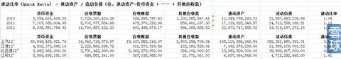 数据分析a.通过分析长城3年的数据,我们可以看到长城的流动比率稳定在1~1.5之间,证明长城的偿债能力一般。b.深入分析长城的流动资产发现,长城最大的两项流动资产为风险极低的货币资金和风险较低的应收票据,让人比较放心。c.通过比较,我们可以看到长城在同行业中处于中间水平。4.速动比率(Quick Ratio)关于速动比率a.速动比率同流动比率一样,反映的都是单位资产的流动性以及快速偿还到期负债的能力和水平。b.速动资产是那些可以在较短时间内变现的资产。c.速动比率以流动资产扣除①变现能力较差的存货和②不能变现的待摊费用,作为偿付流动负债的基础,它弥补了流动比率的不足。d.当速动比率>1时,资金流动性好;当速动比率<0.5时,资金流动性差;介于之间,资金流动性一般。