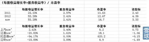 6.(每股收益增长率+股息收益率)/市盈率关于该指标a.这是林奇在讲市盈率时提出的一个指标,测量的是EPS的和与PE之间的关系。b.当它的结果大于2时,股票具有极高的投资价值;介于1和2之间,股票还不错;小于1时,股票投资价值不高。