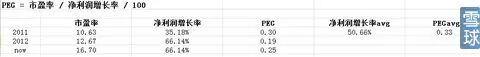 数据分析a.长城的PE低于EPS增长率3倍左右,由此证明它是一只被低估的好股票。b.但是需要强调的有2点:①汽车行业的平均PE并不高②小心当它无法延续高增长时,PE会近一步下降,股价将有可能迎接戴维斯双杀(就像它的前辈们一样)。5.PEG(市盈率相对盈利增长比率)关于PEGa.PE低,增长又快的公司有一个典型特点就是PEG会非常低。b.投资者通常认为,PEG低于1的股票才能算得上是好的投资标的,并且越低越好(甚至低于0.5)。不过也有投资者称,0.7-0.8范围内PEG的股票最适合投资。c.由于净利润增长率并不能保证稳定,我建议求平均值,再计算现在的PEG。但这种情况并不包括出现过极值的公司,用了平均值反而不好。